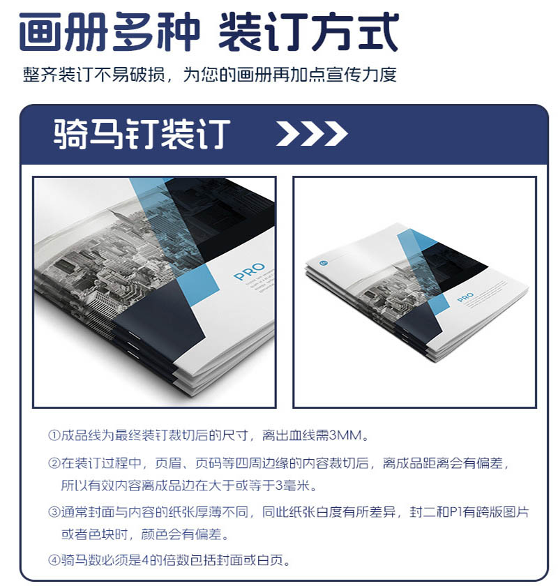 裝訂工藝:騎馬釘、無線膠裝、鎖線膠裝、蝴蝶裝、鎖線精裝、線圈等