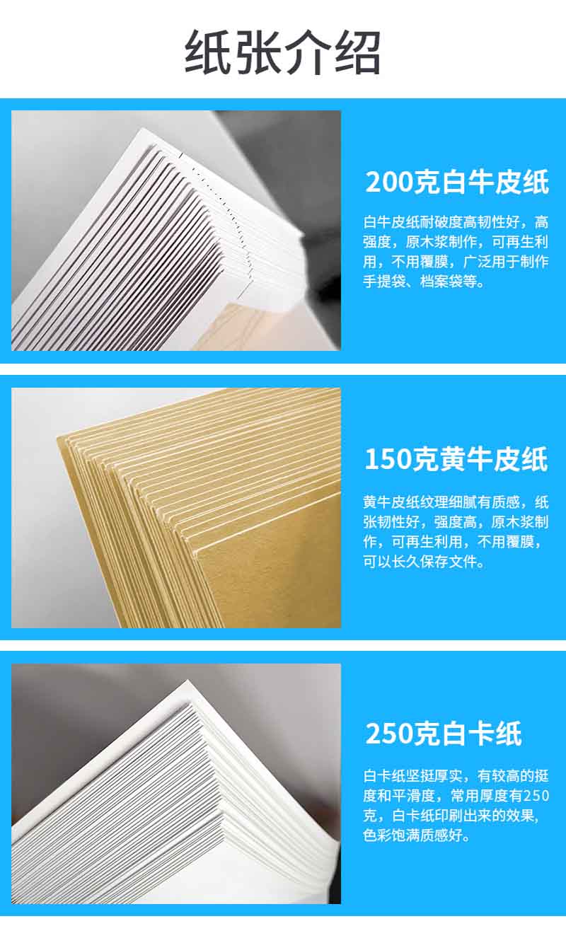 印刷紙張:銅版紙、雙膠紙、啞粉紙、珠光紙、其他藝術(shù)紙(藝術(shù)紙種類較多我們可以免費(fèi)提供紙樣供您選擇)