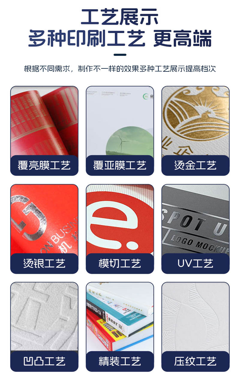 印刷紙張:銅版紙、雙膠紙、啞粉紙、珠光紙、其他藝術(shù)紙(藝術(shù)紙種類較多我們可以免費(fèi)提供紙樣供您選擇)